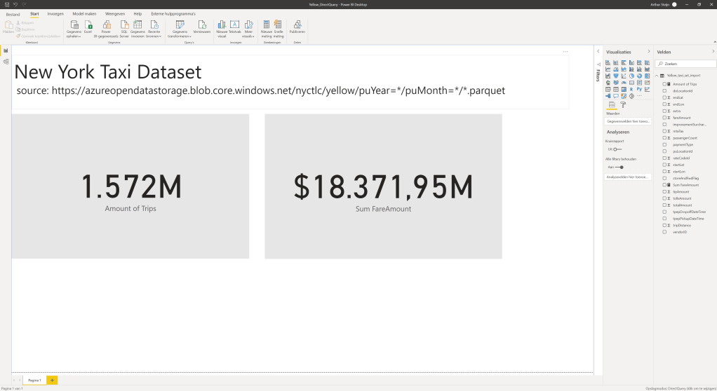 Be aware of the limitations of Import and Direct Query mode. In another example, I made a view of the NYC Taxi Open dataset. And loaded it to Power Bi with the Direct Query mode to prevent the .pbix file from blowing up with the 1.572.000.000 rows.