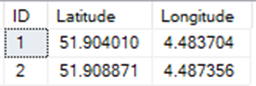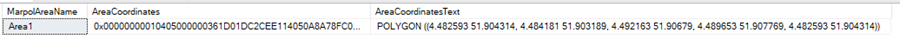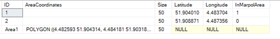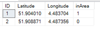 In the second part, we identify if a coordinate is inside our polygon area. This is done with the STIntersects function in SQL. We use our geometry point column (LatLon) to check if this is inside the polygon. We do a CROSS JOIN to our area table so in case we have multiple areas we check them all. The data looks like this: