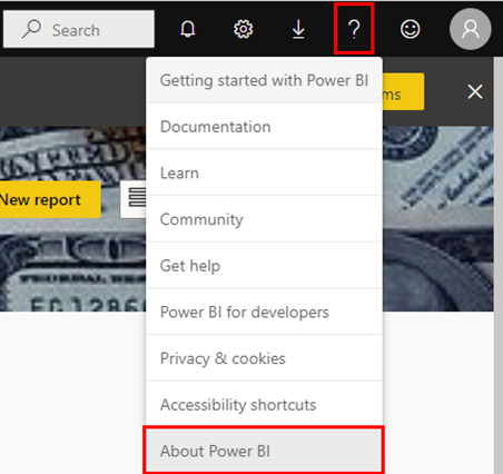 Now, where to find your tenant ID? In the top menu select the question mark and go to About Power BI: