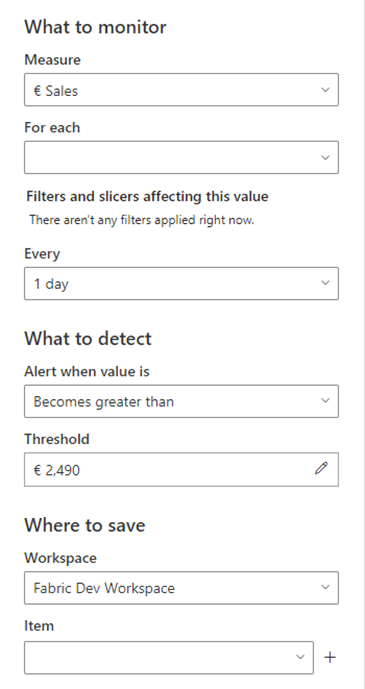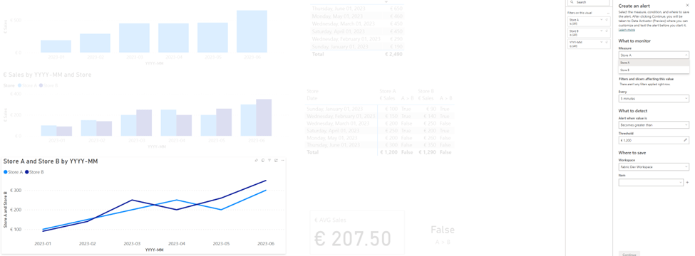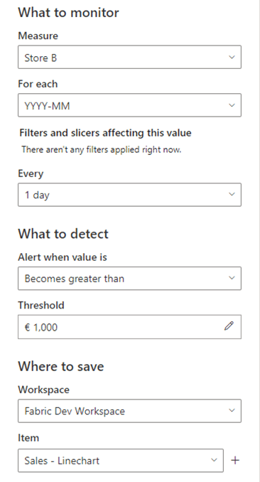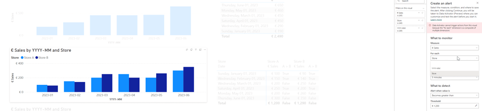 For the line chart I created two separate measures for Store A and Store B, and in the “What to monitor”, you can choose which measure needs to be chosen from the visual. Now it would be nice if you could create two Triggers at the same time, one for the measure of Store A and one for Store B, but haven’t figured that one out yet.