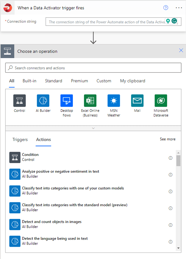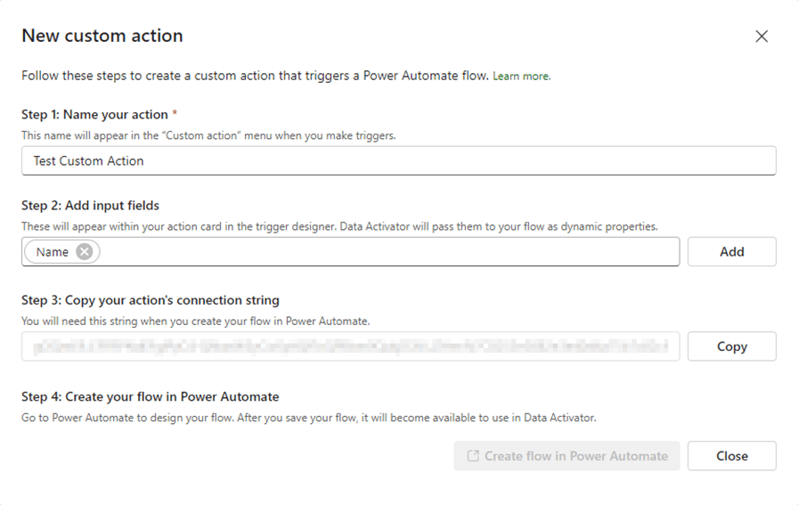 After you copy the connection string and press Create, Power Automate will open, with a preselected step from Data activator, where you only have to copy your connection string:
