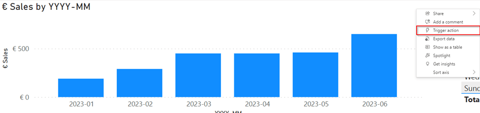 When you open the report online, you can click on the three dots in the header icons and select Trigger action.