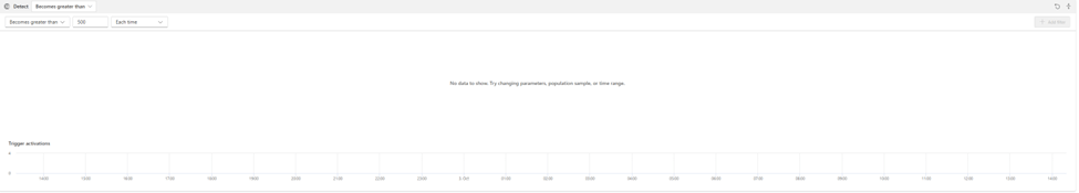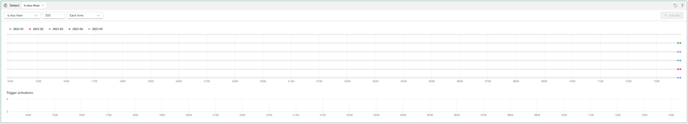 Because so far there hasn’t been a value higher than 500. So, no triggers have been activated. If we change the “Becomes greater than” to “Is less than”, we can see the same data points as in the first value (since all of them are less), but this will affect our detection, so let’s put it back: