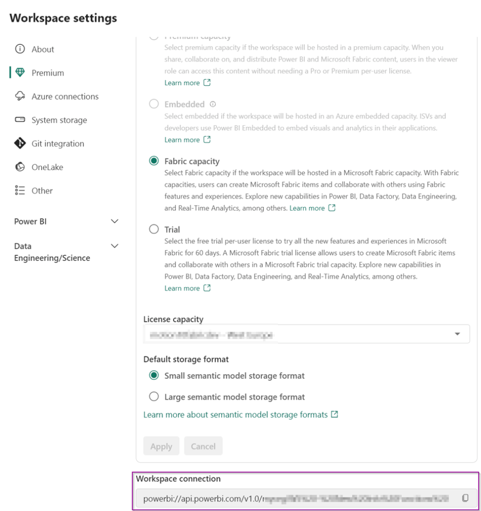 If you are lucky enough to have a Fabric capacity, Premium capacity, or Premium Per User license, you can enable the XMLA endpoint. In the workspace settings, go to the workspace connection: