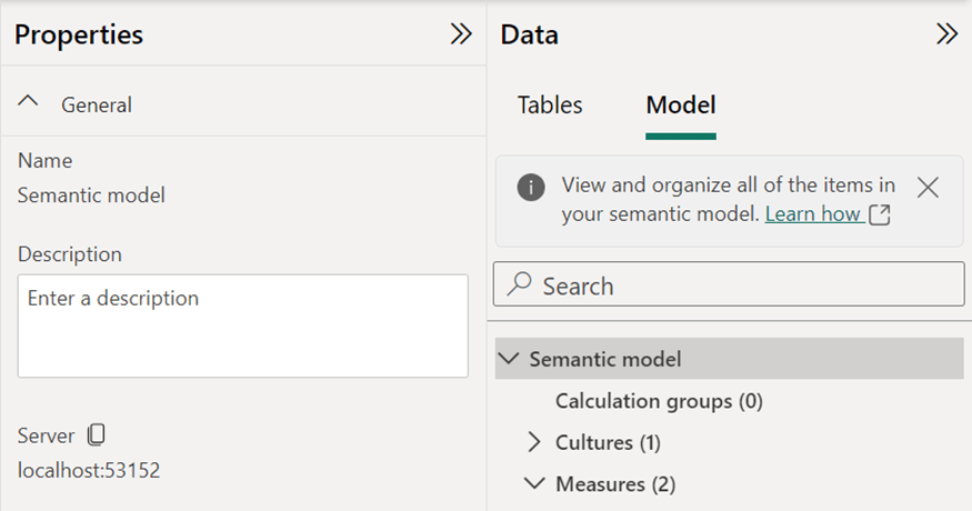 In the model view, go to Model (instead of Tables, on the right) and select “Semantic model”. Here you will find the information about your data model, including the name of the server! Also added in December: