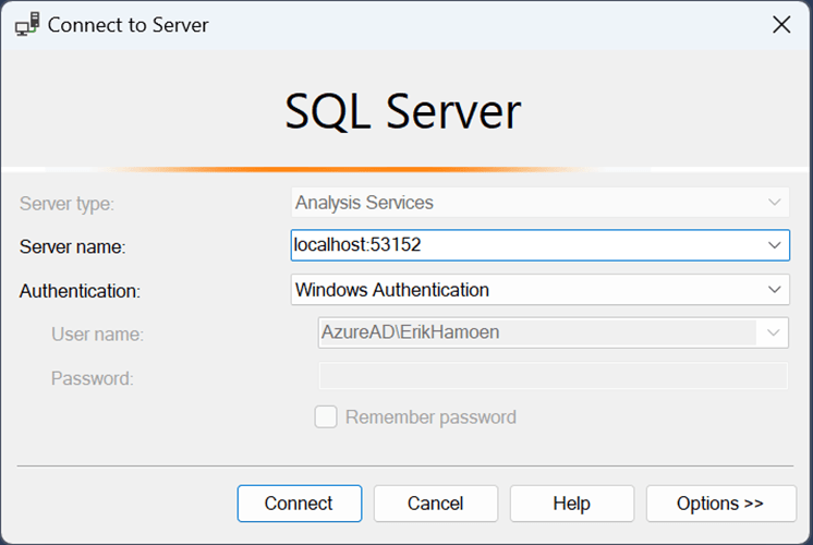 Now copy the server name, open for example SSMS, and connect to the Analysis server:
