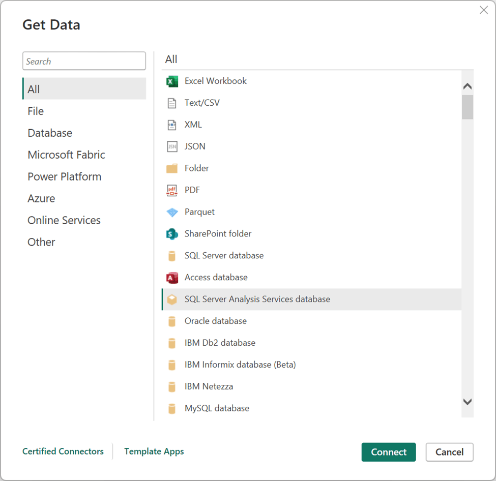 After you connect, expand the databases, and here you find the GUID for the database that runs your Power BI report. Copy this GUID as well, and let’s go back to Power BI! Add a new source, and select the “SQL Server Analysis Services database”: