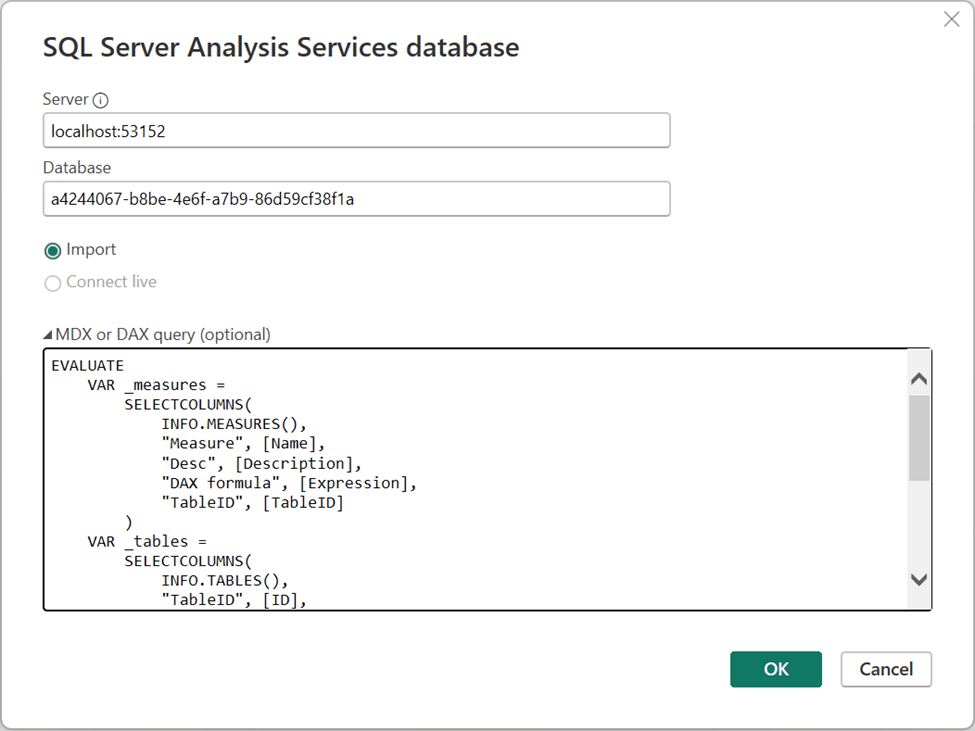 Another option is to create a separate report that connects to the localhost and remove the localhost query from our report. Now, I can refresh the main model and must keep a separate report for the explanation. So, every time we create a new measure, we manually need to refresh the extra report and publish it. And not only that. We also need to change the connection string, because when you close the report and open it again, you will see that the Server and Database GUID changes. Luckily that is very easy to change and will add not more than 5 minutes to your work. But there is a better solution, for everyone that has access to the XMLA endpoint!