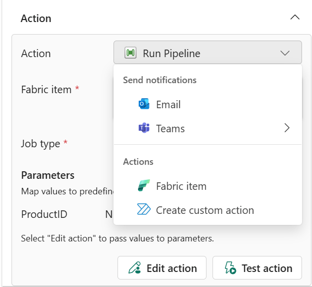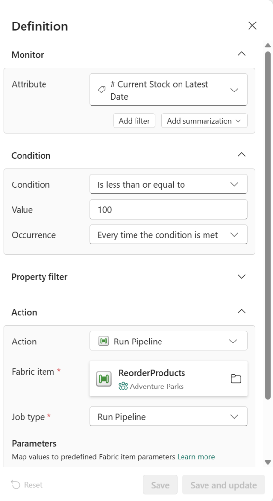 As mentioned earlier, make sure you select the correct condition trigger! It took me quite some time to figure out why it didn’t work as expected. In the beginning, I also had a refresh semantic model action in my pipeline. But when 14 products are being ordered, it’s also trying to refresh 14 times.