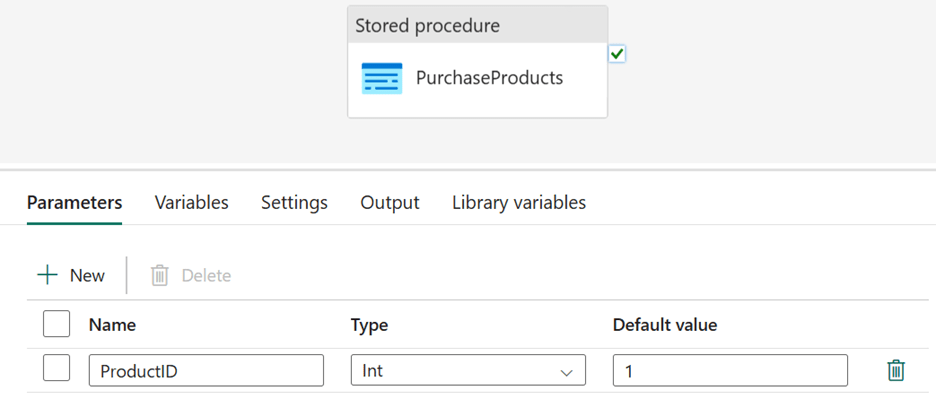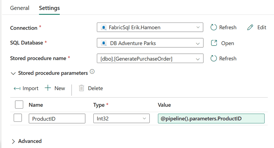 In this pipeline, the only thing I have is a stored procedure activity that runs an SP that generates purchase data and also updates the stock table. My SP needs a ProductID (to “purchase” the correct product). To do that, I create a pipeline parameter: