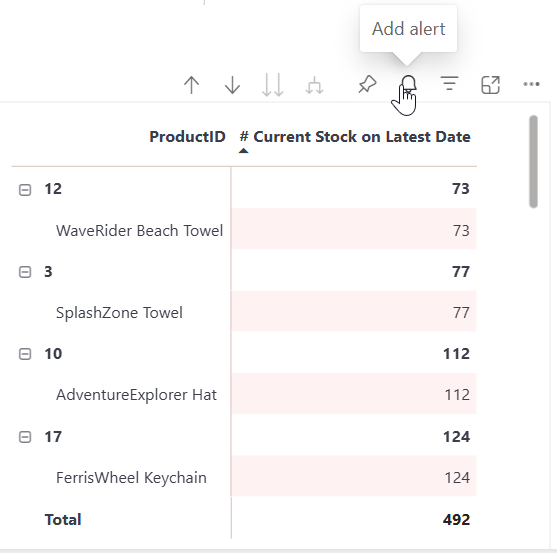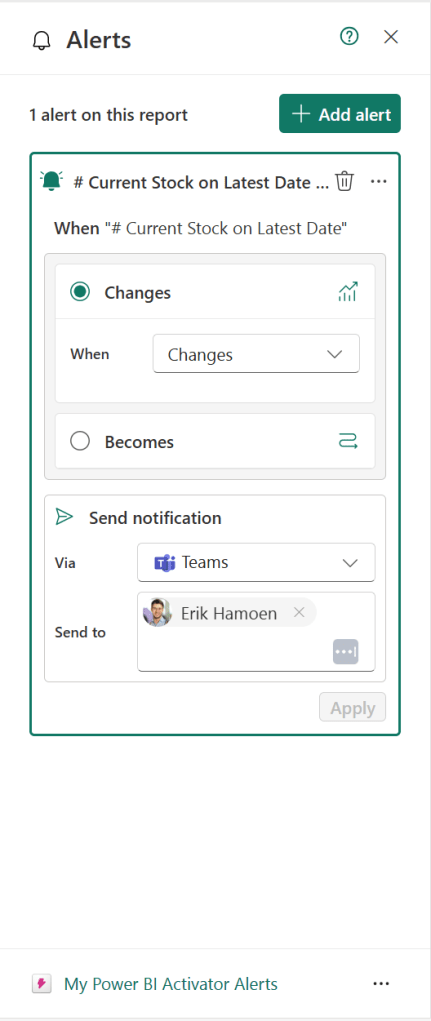 Whenever the value is below or equal to 100, it should run. Please note, before I had the condition on “becomes less than or equal to …” That’s a tiny difference with a lot of impact. When the value was already below 100, it wouldn’t do anything. Another thing is that the value needs to be hardcoded. My products have different “minimum stock levels”, but I can’t set a dynamic value here. To do so, you can create a measure that checks if the current stock is higher than the minimum stock level and then make a rule on that measure. Like I did here: https://sidequests.blog/2020/12/09/variable-thresholds-for-your-power-bi-alerts-with-a-streaming-dataset/